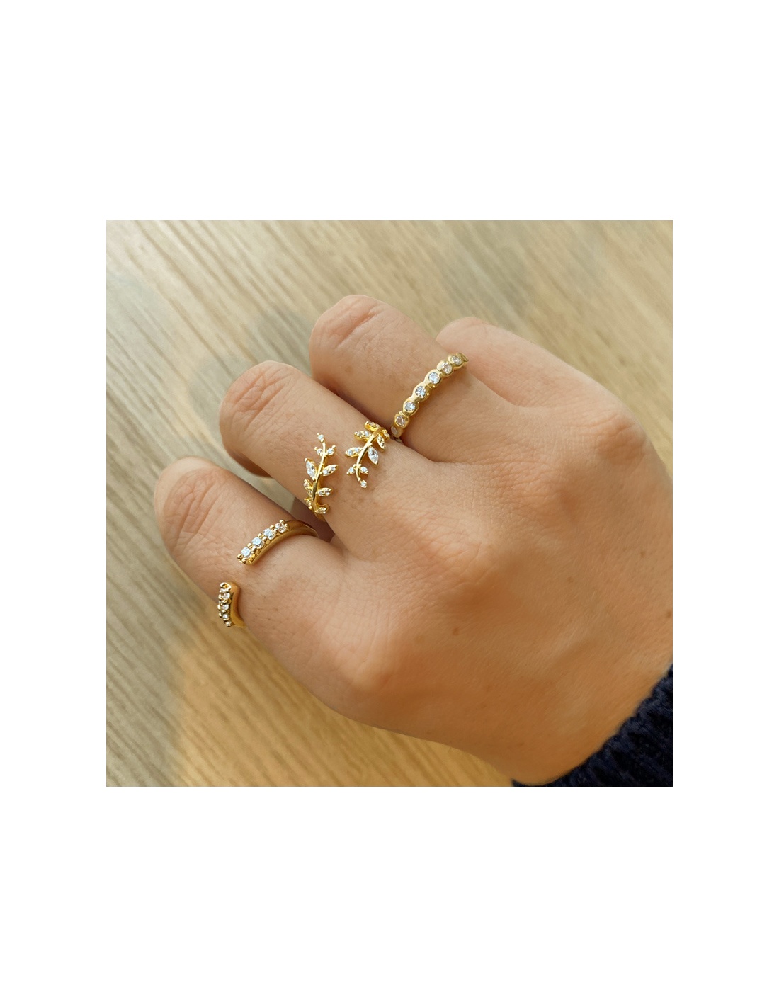 Anillo de plata 925 entreabierto con forma de hojas decorado con circonitas blancas. Un anillo elegante y original que permite regular el tamaño.
