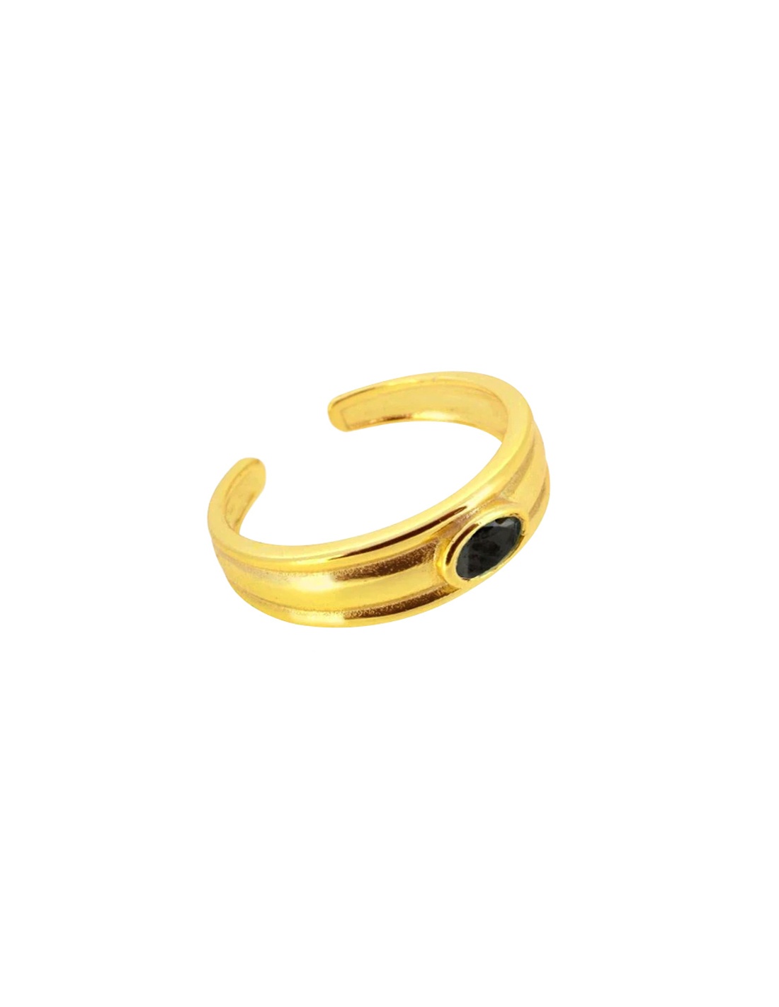 Anillo de plata bañado en oro con circonita negra central. Anillo entreabierto que permite un pequeño ajuste.