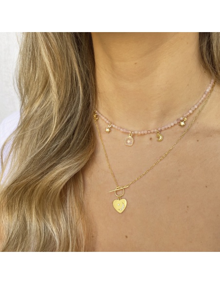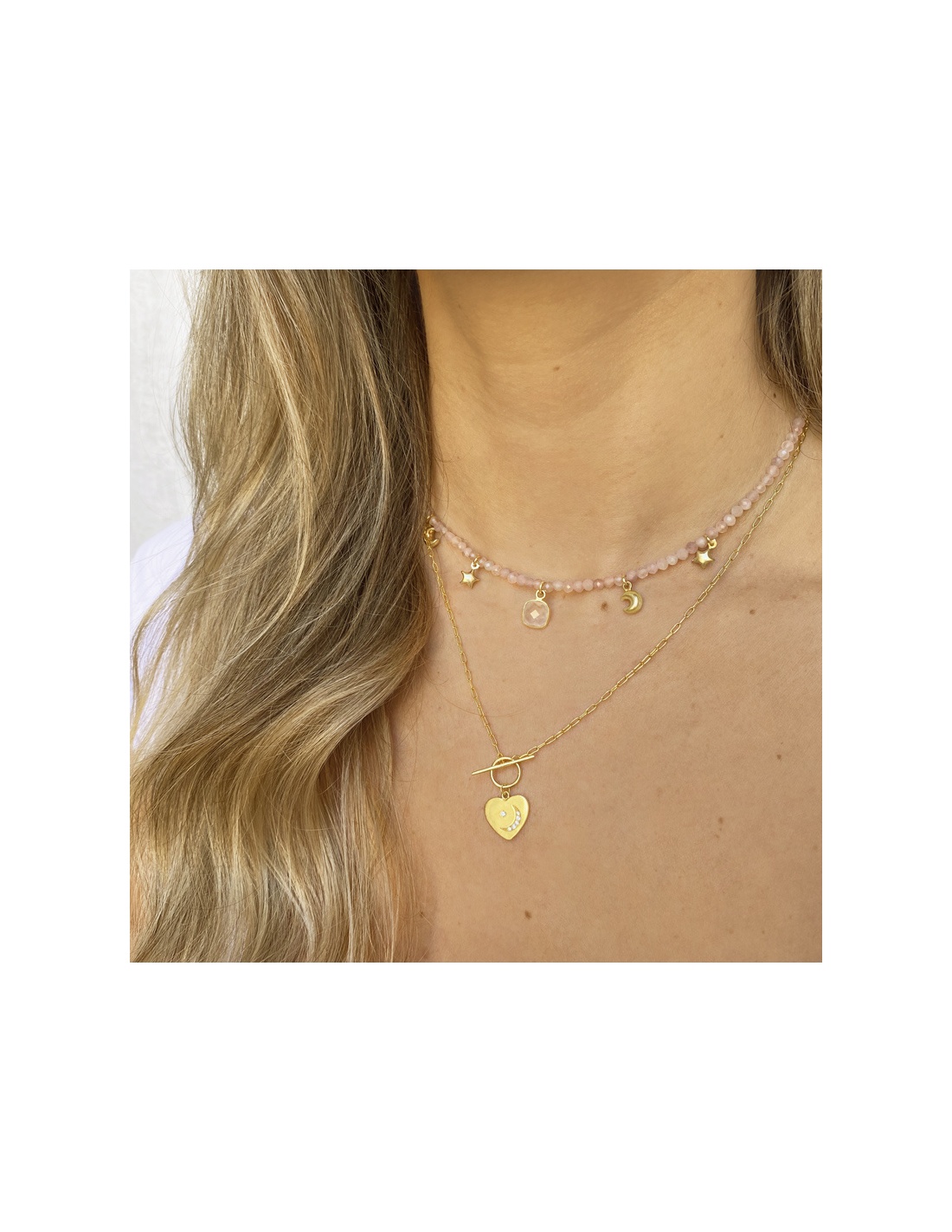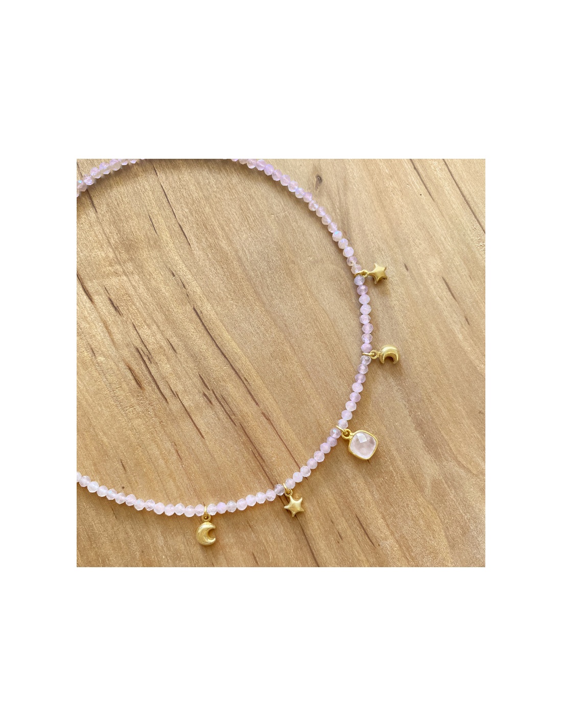 Collar tipo choker de piedras naturales en color rosa palo con colgante de cuarzo y mini lunas y estrellas de plata bañados en oro.