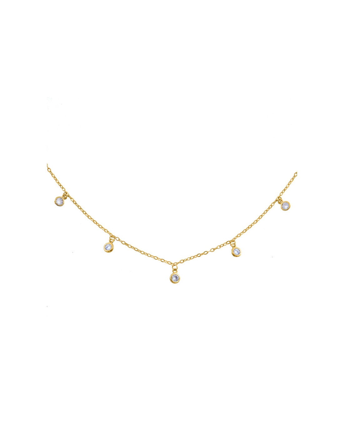 Collar tipo Choker de plata de ley bañado en oro con colgantes con circonitas redondas.