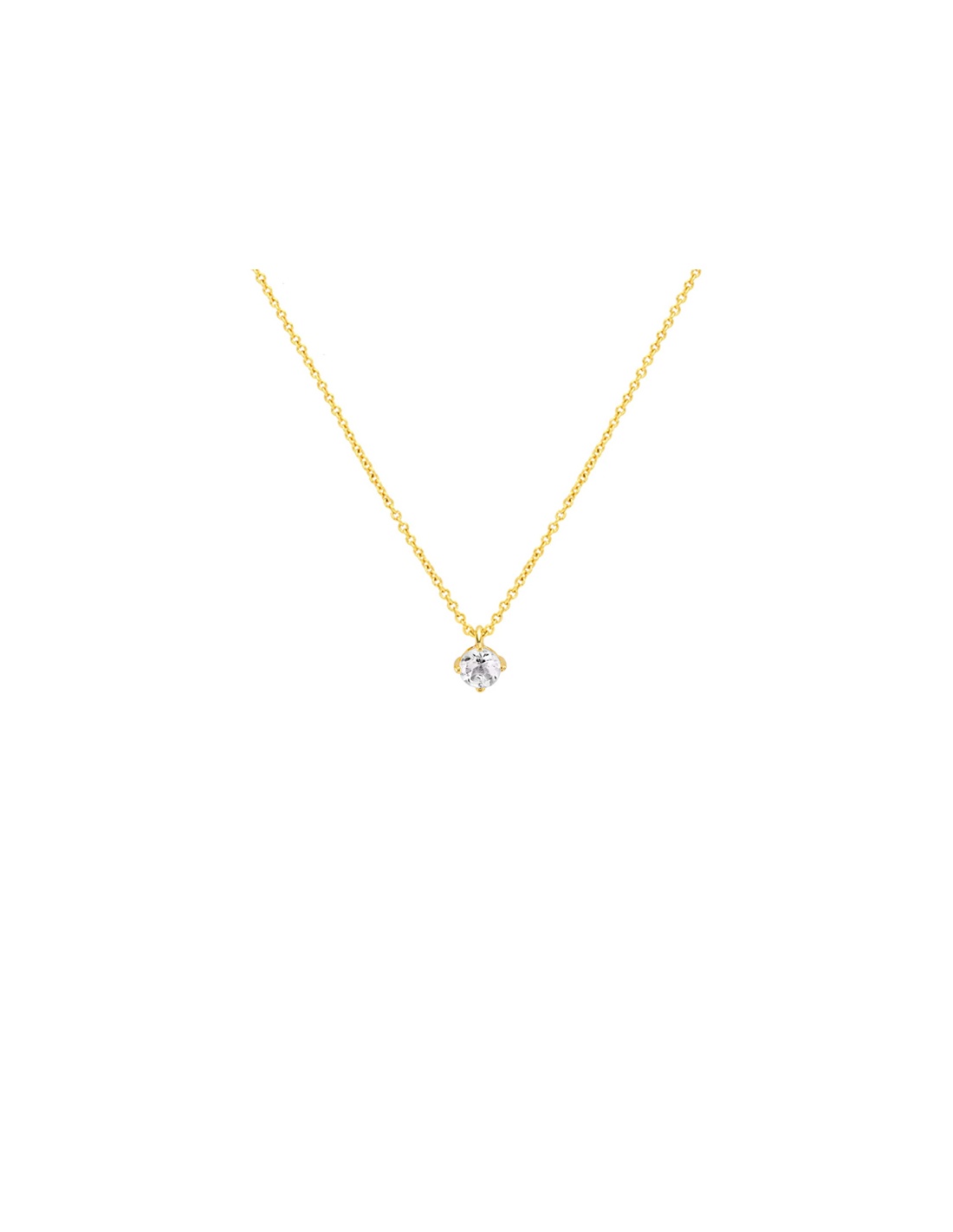 Collar con colgante de circonita blanca redonda acompañado de cadena de eslabon fino de plata bañado en oro.