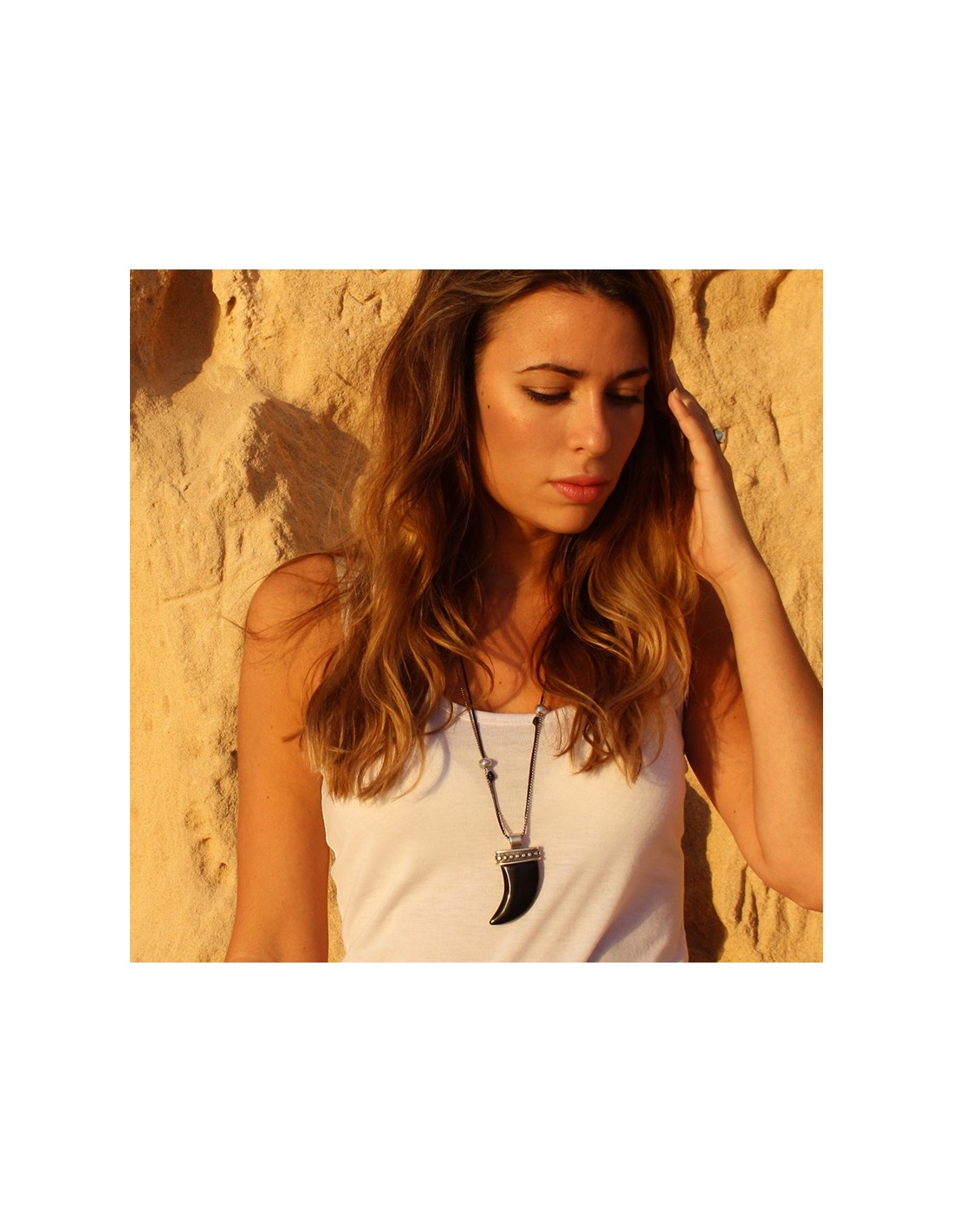 Colgante largo con cuerno negro, cadena de bolitas, cuero negro y cuentas bañadas en plata