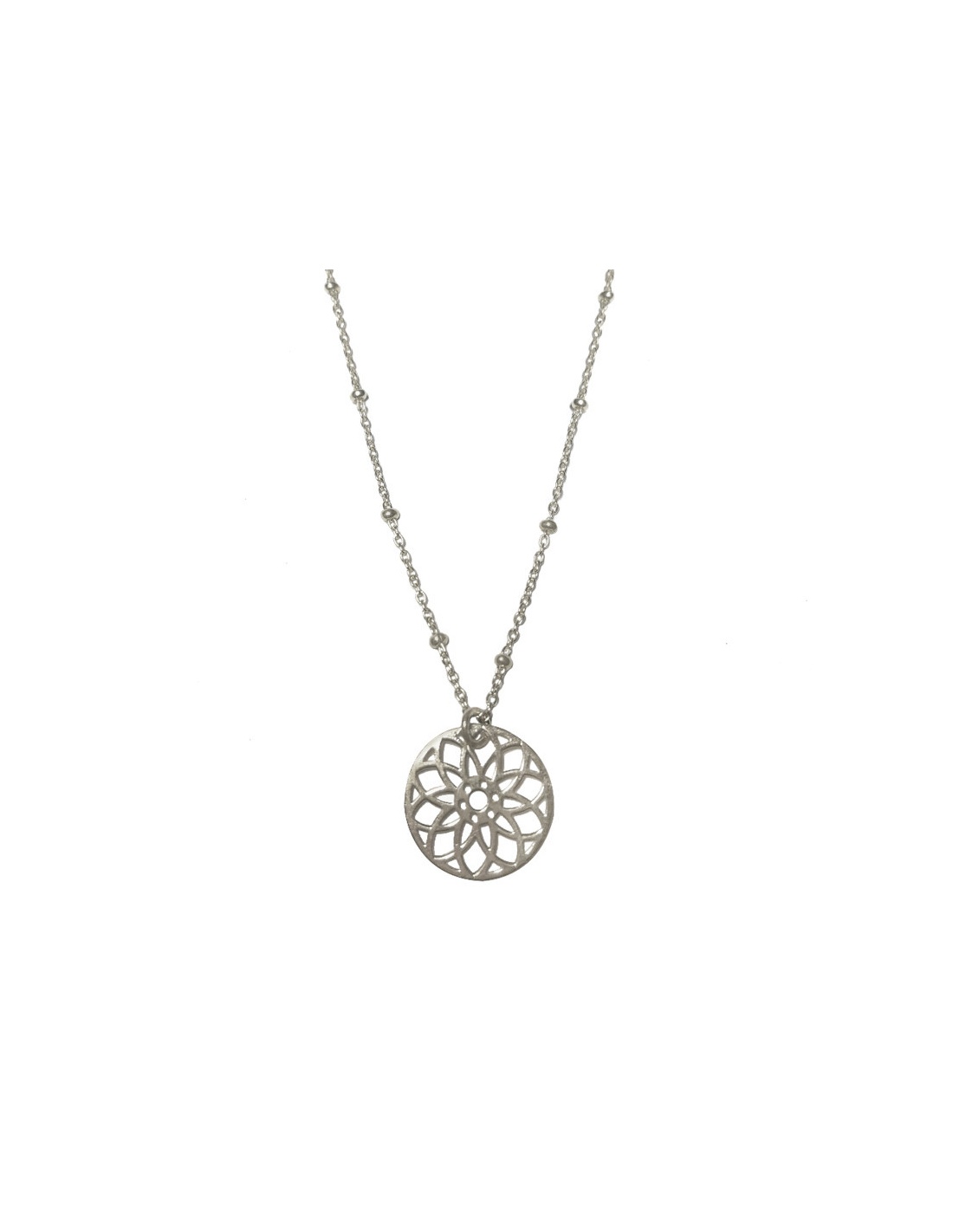Collar con colgante mandala de plata de ley con cadena de eslabones y bolitas. Un collar muy especial y elegante para llevarlo solo o combinado con otros colgantes de diferentes larguras.