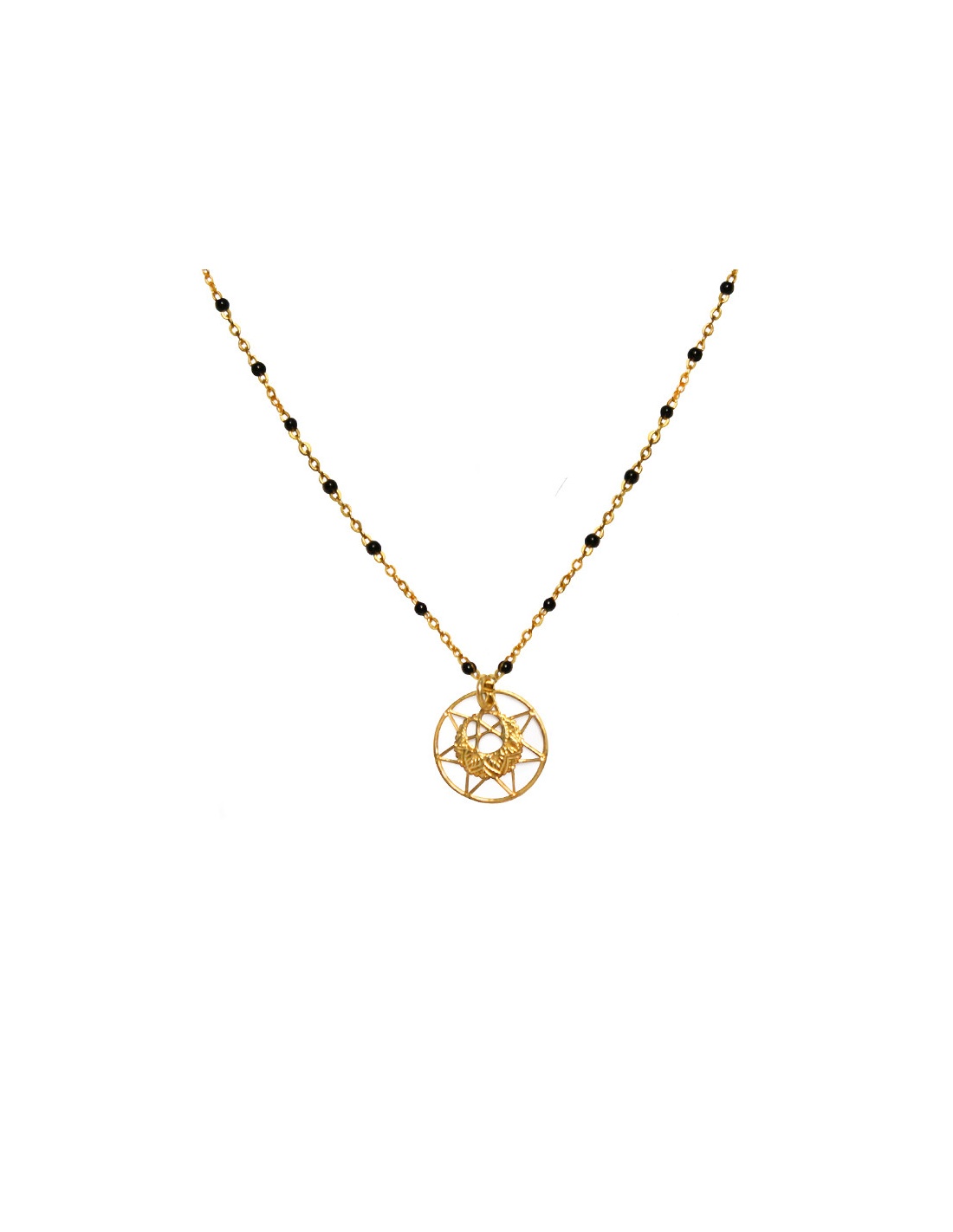 Collar con colgante de mandala y cadena fina de eslabones y bolitas negras de plata de ley bañada en oro.