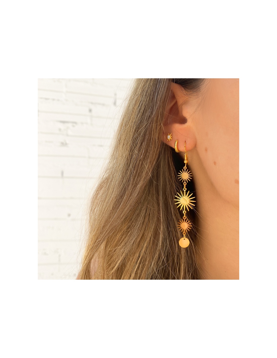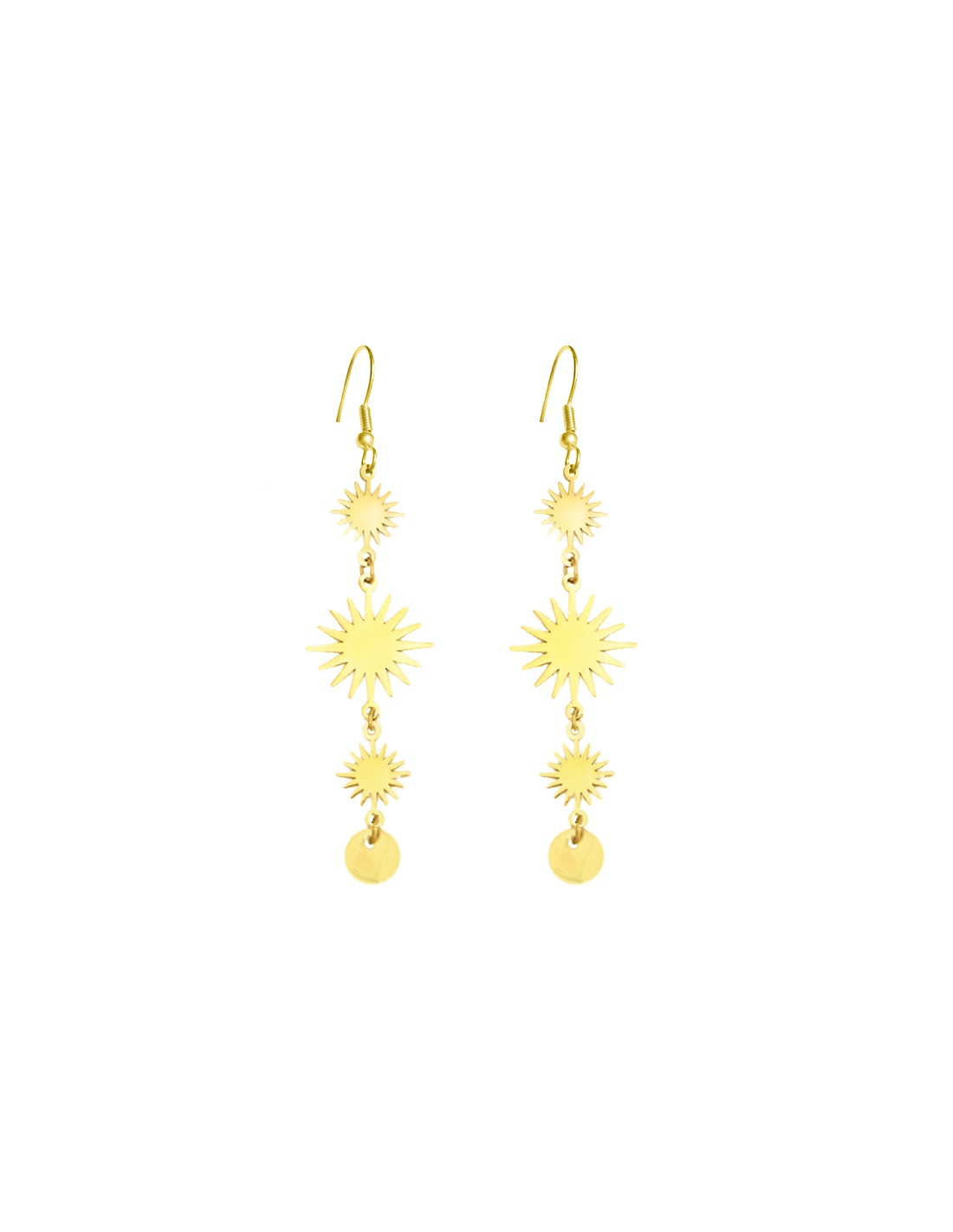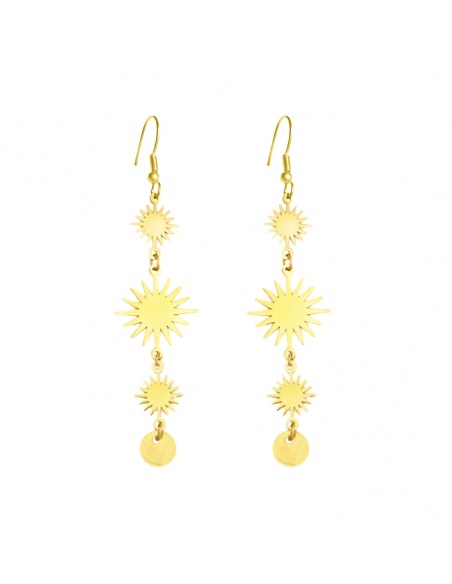 Pendientes largos con colgantes de soles de distintos tamaños de acero bañado en oro. Unos pendientes elegantes y de tendencia para dar un toque especial a cualquier look.