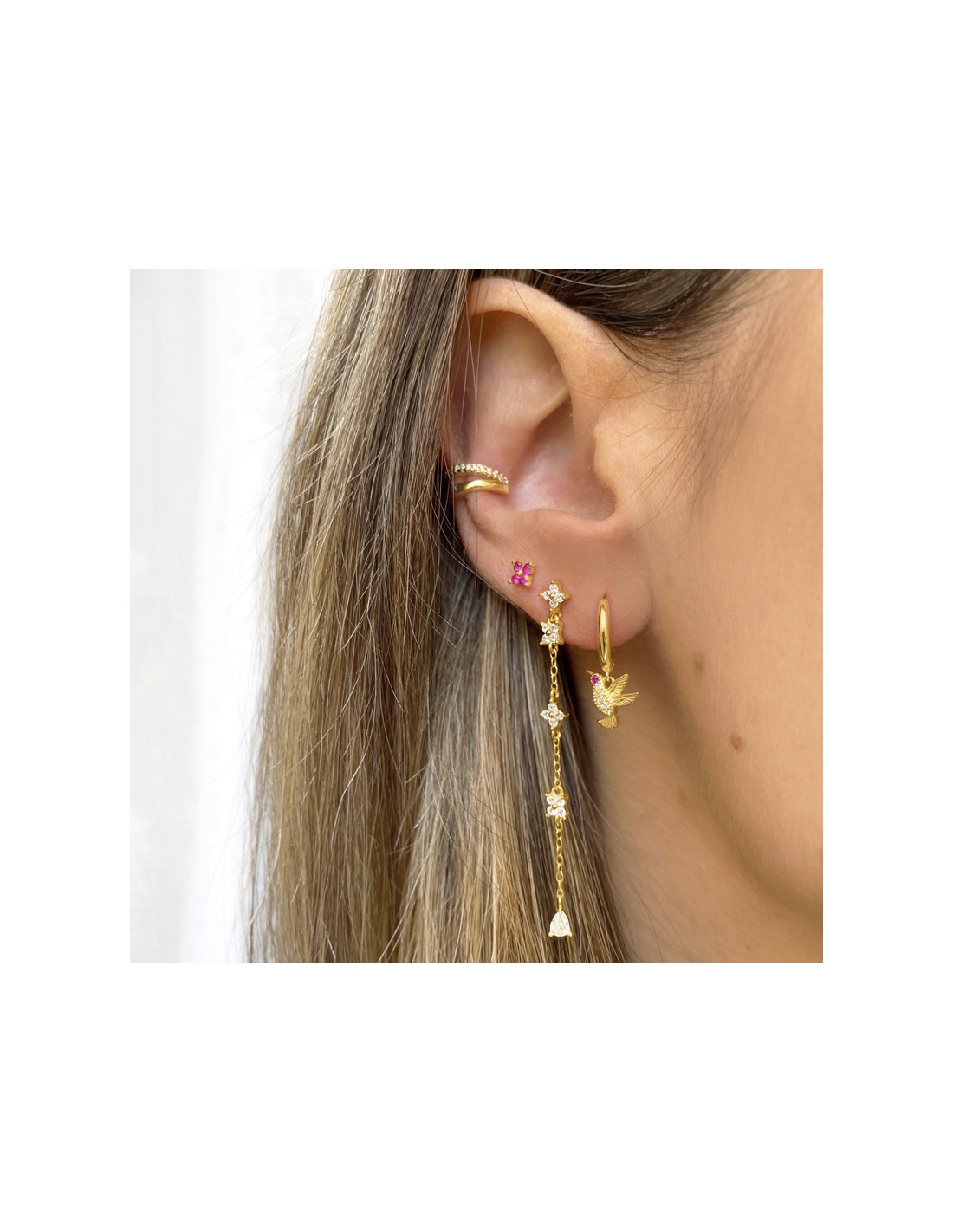Pendiente largos de plata 925 bañados en oro con detalles de flores con circonitas blancas. Cierre de presión. Unos pendientes elegantes y favorecedores que permiten utilizarlo en el día a día para dar un toque glamuroso a cada estilismo.