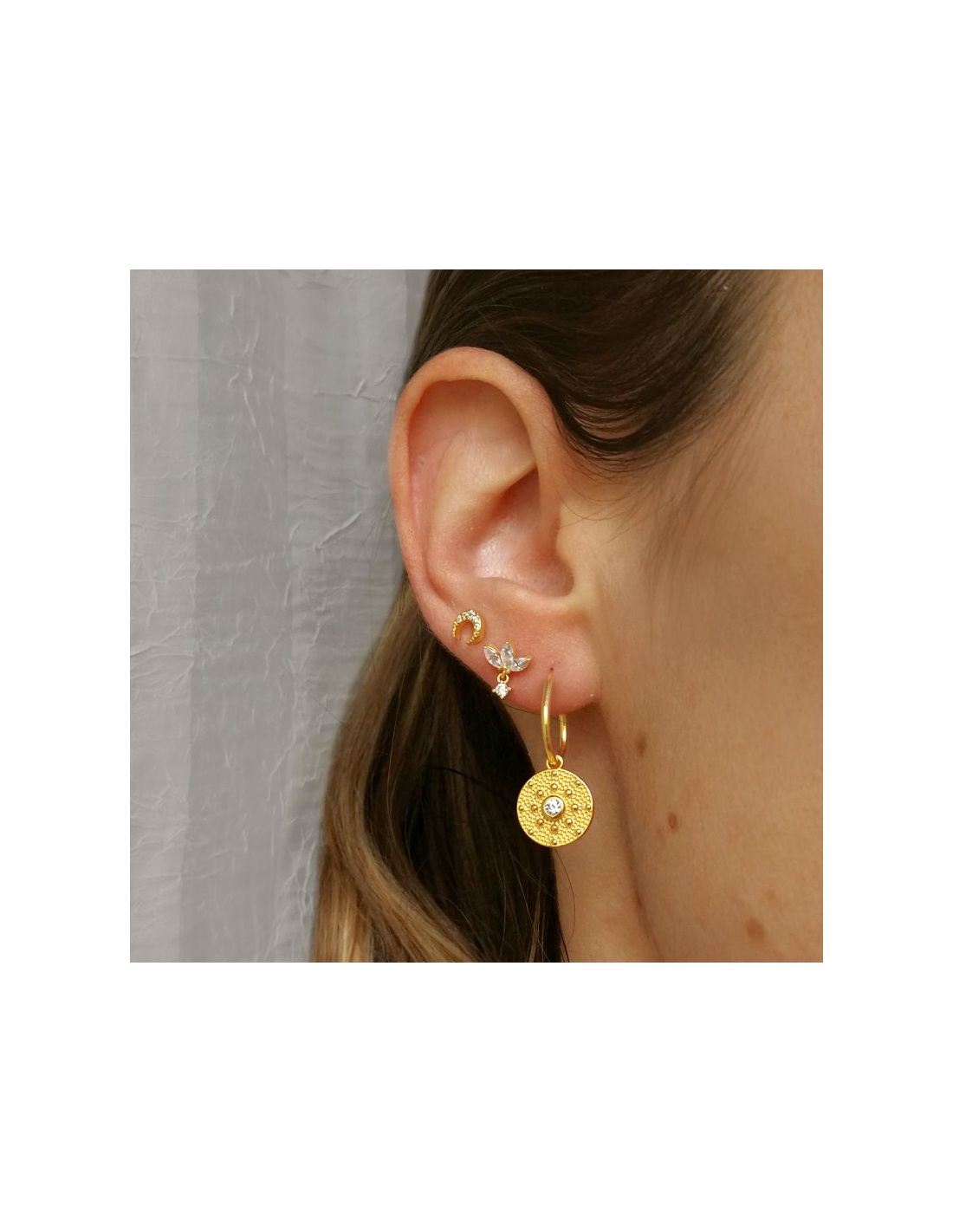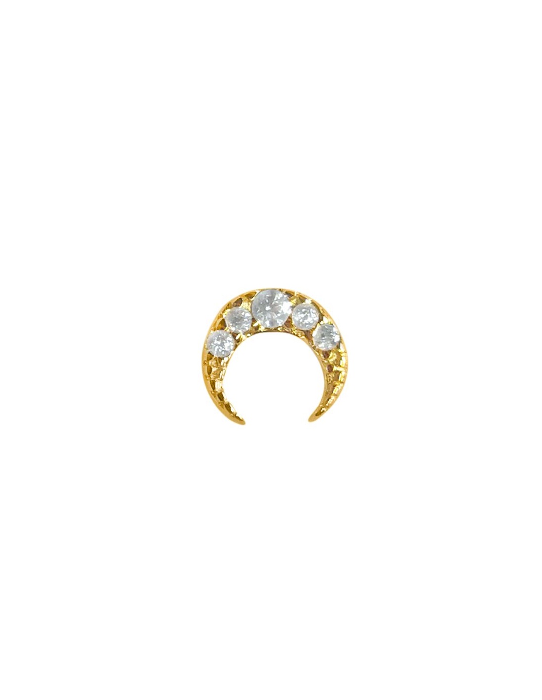 Pendiente de media luna con circonitas blancas de plata bañado en oro. Pendiente ideal para combinar con otros pendientes mini en piercing secundarios. Se vende por unidad.