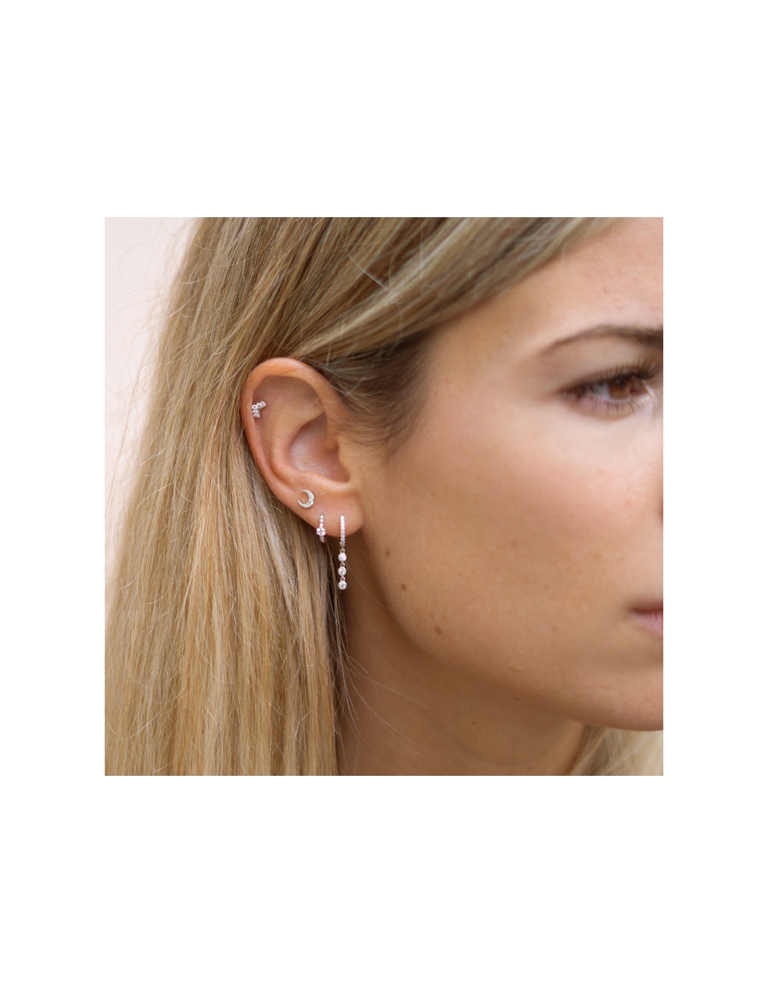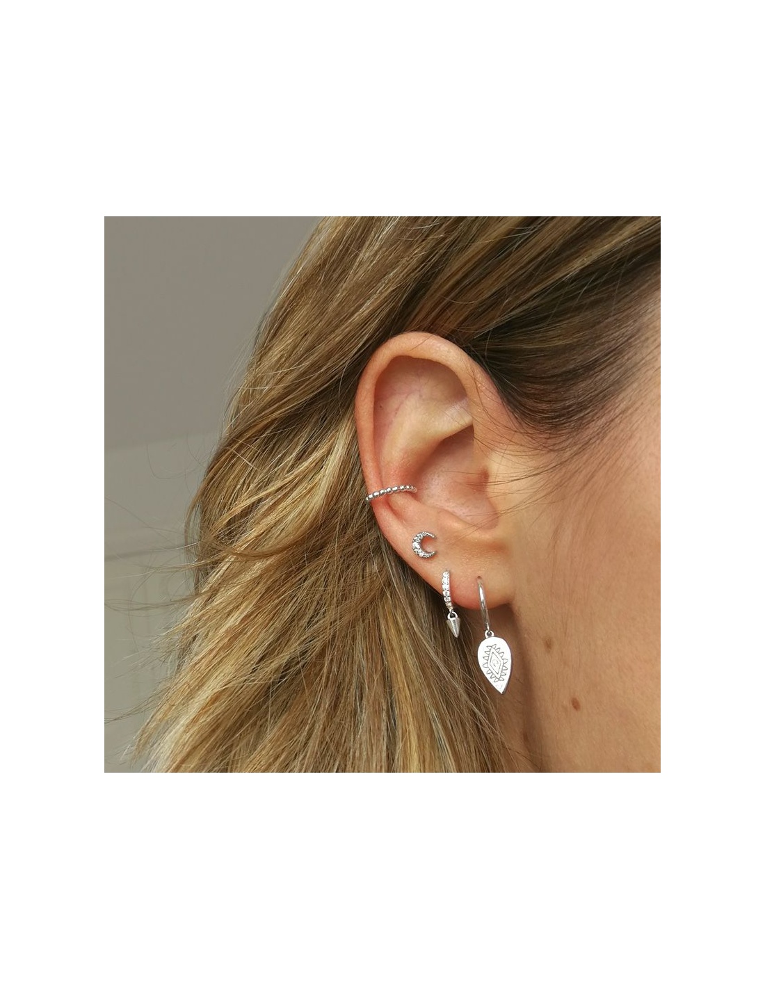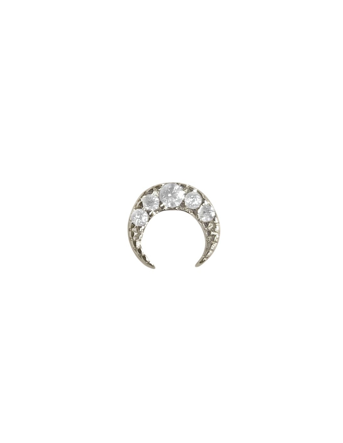 Pendiente de media luna con circonitas blancas de plata. Pendiente ideal para combinar con otros pendientes mini en piercing secundarios. Se vende por unidad.