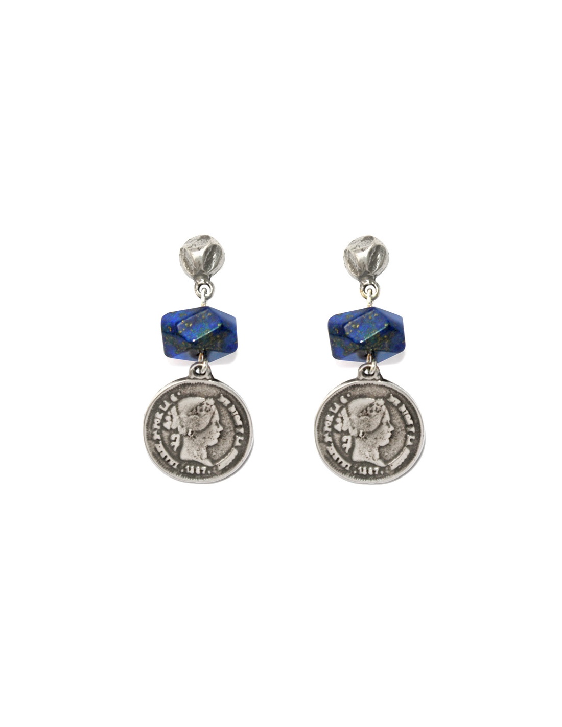 Pendientes con base esférica irregular, monedas antiguas con baño de plata y piedras de lapislázuli