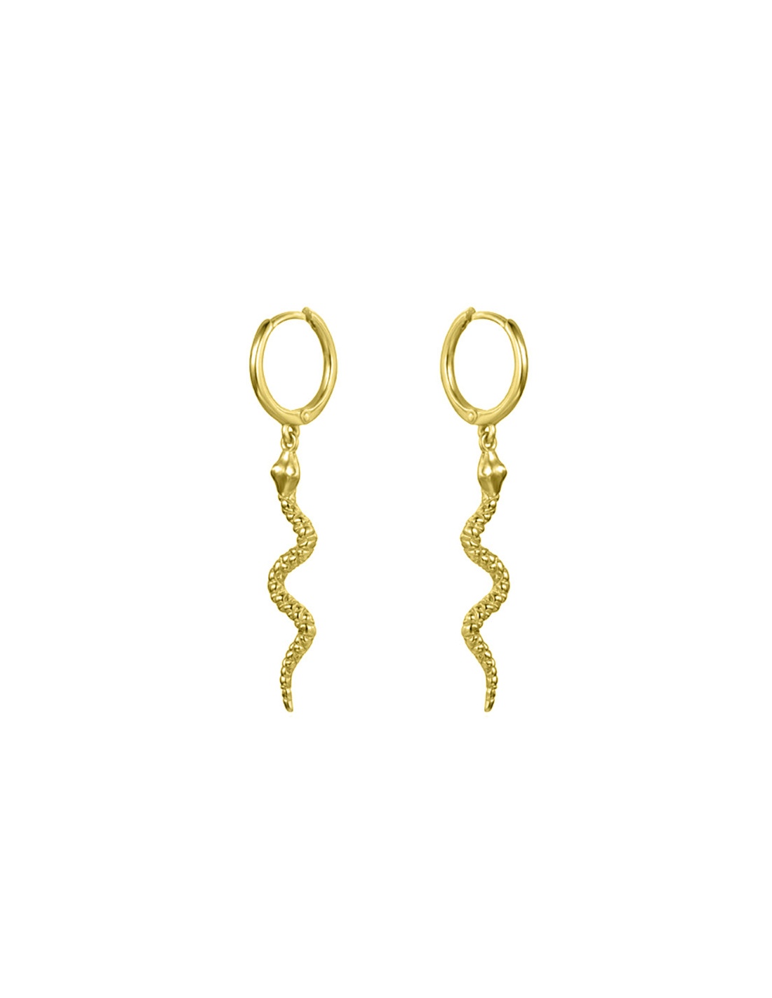 Pendientes largos con base de aro y colgante de serpiente texturizada de plata de ley bañados en oro. Unos pendientes originales y de máxima tendencia.