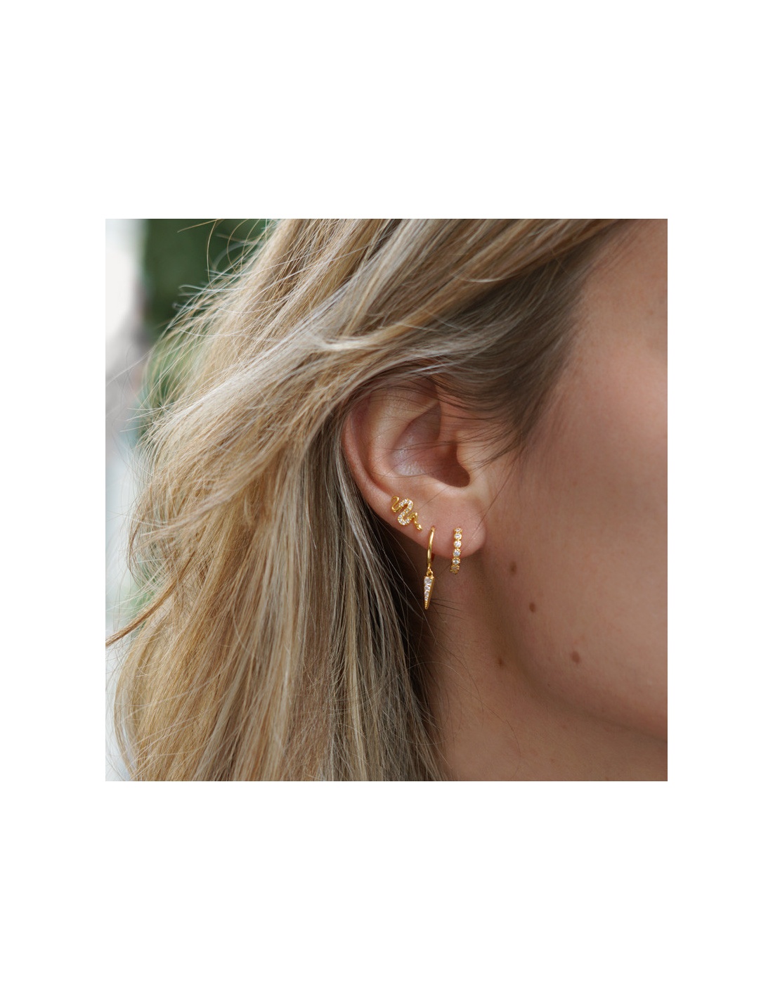 Pendiente en forma de serpiente con circonitas en plata de ley bañado en oro. Unos pendientes de máxima tendencia con efecto pendiente trepador para agujero principal o agujeros secundarios.