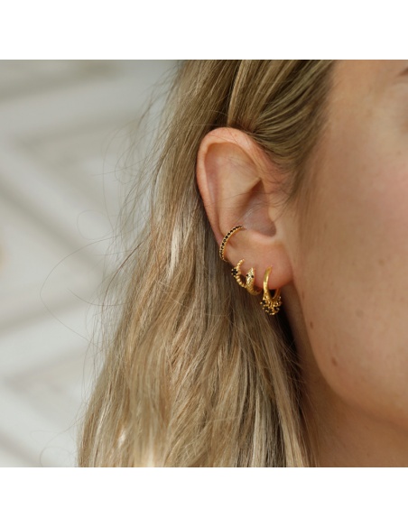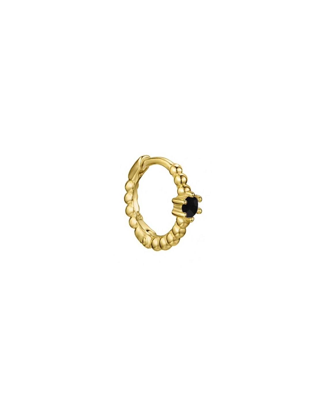 Pendiente mini de aro de bolitas y circonita negra central de plata de ley bañado en oro.