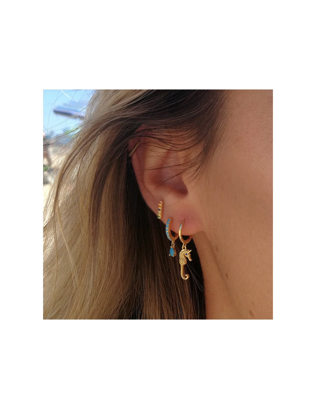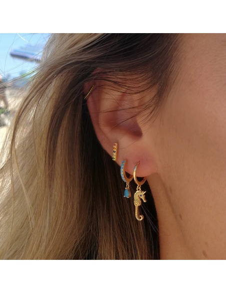 Pendientes de plata bañados en oro con base de aro y colgante de caballito de mar con circonita azul.