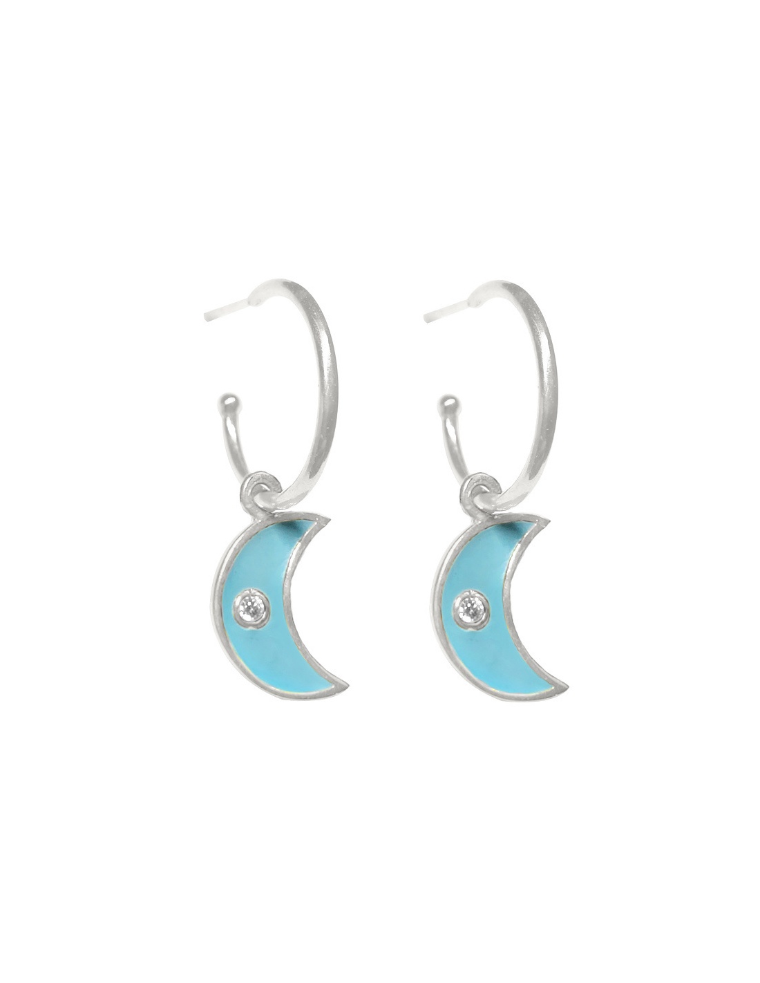 Pendientes de aro con colgante de luna esmaltado azul con circonita central de plata 925. Unos pendientes originales y favorecedores para agujeros principales.