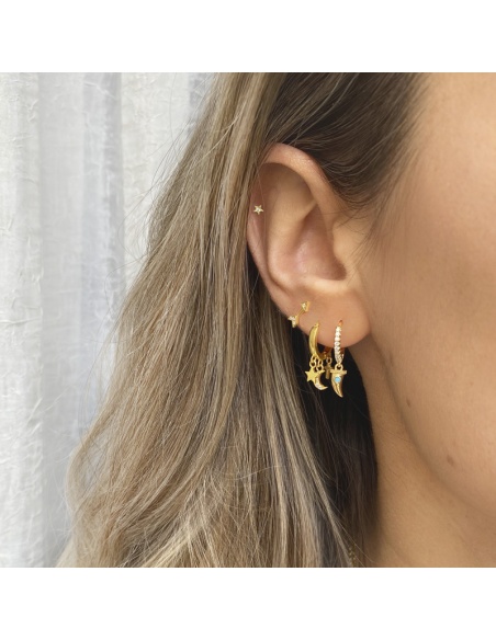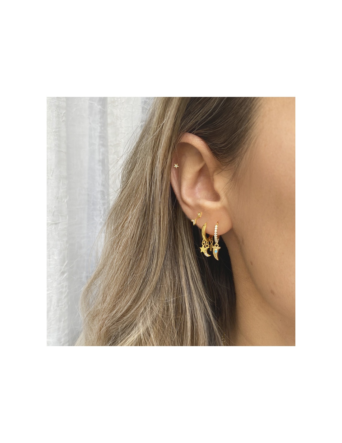 Pendiente de aro con colgantes de estrella,luna y cruz de plata de ley con baño de oro. Un pendiente original y de tendencia para agujeros principales o secundarios.