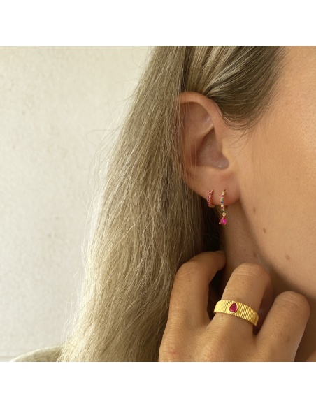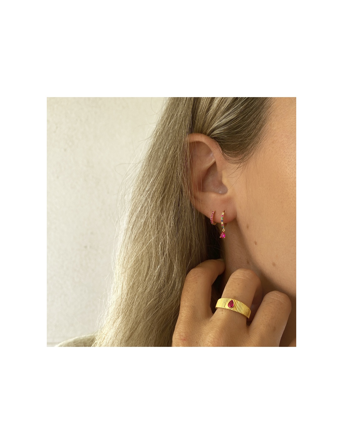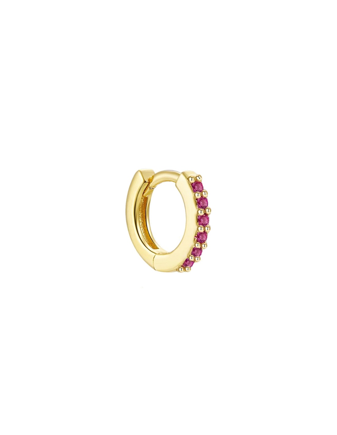 Pendiente de aro con circonitas fucsia de plata bañados en oro. Un pendiente básico con un toque de color para combinar con otros dorados o con circonitas de colores.
