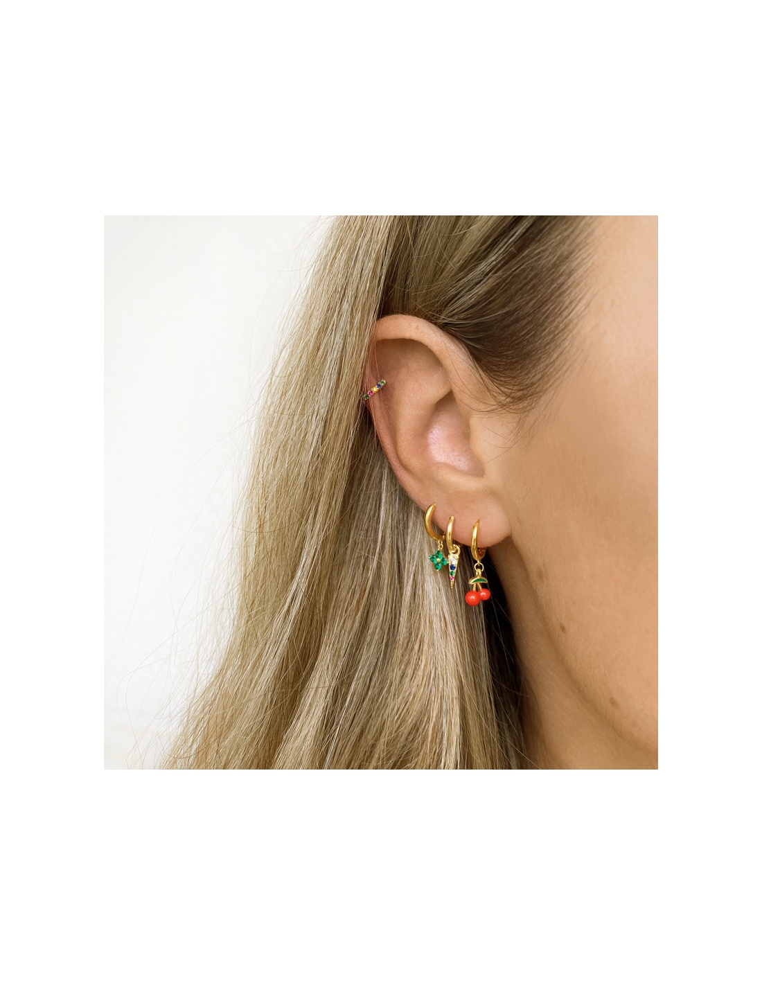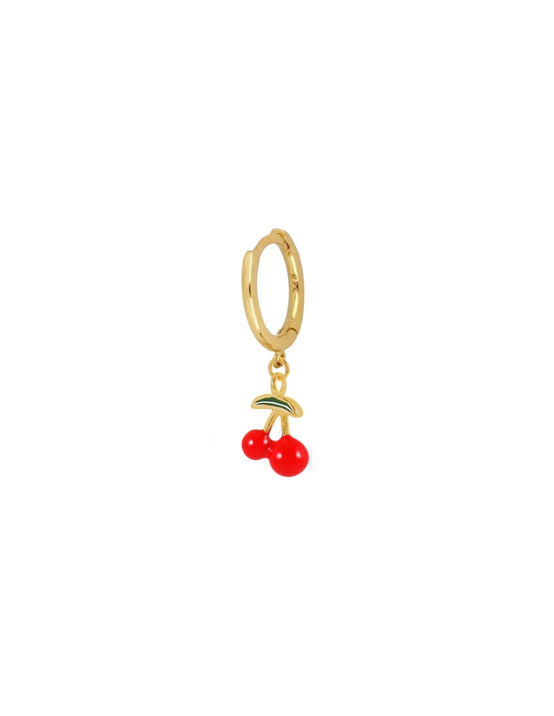 Pendiente de aro con colgante de cerezas esmaltado de plata bañados en oro. Un pendiente original y favorecedor para animar tus looks más veraniegos.