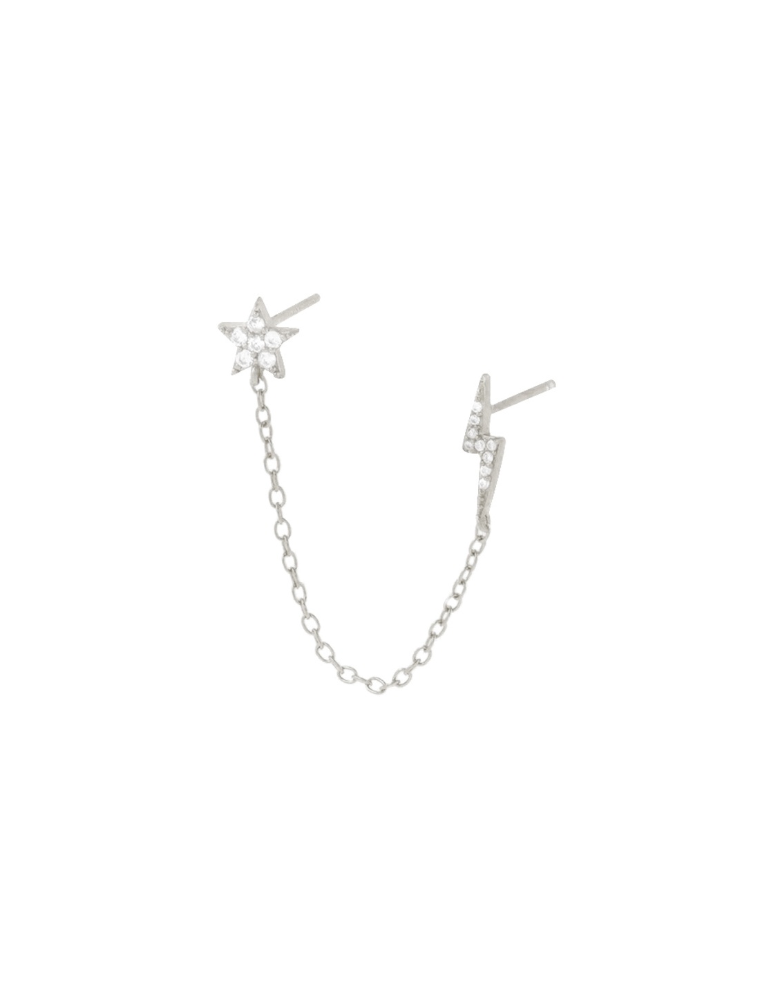 Pendiente con doble anclaje con base de rayo y estrella decorados con circonitas blancas y cadena de plata 925. Un pendiente original para hacer diferentes combinaciones, del agujero principal al secundario, del principal al helix...