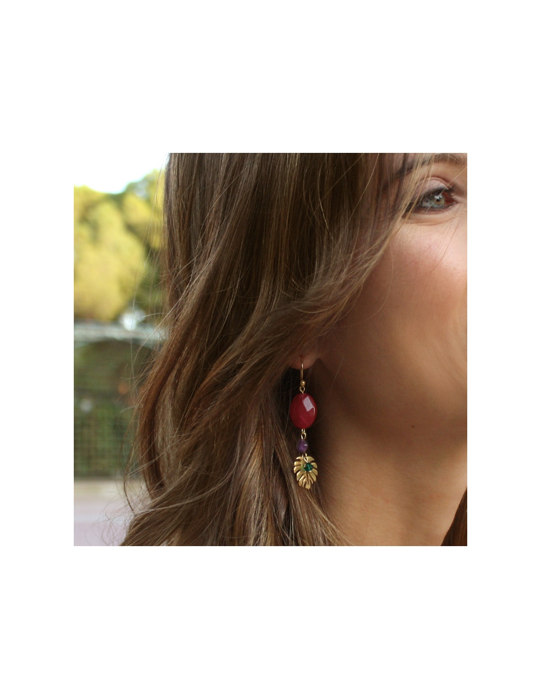 Pendiente de plata de ley bañados en oro con colgantes en forma de hoja, piedras naturales y cristal de swarovski.