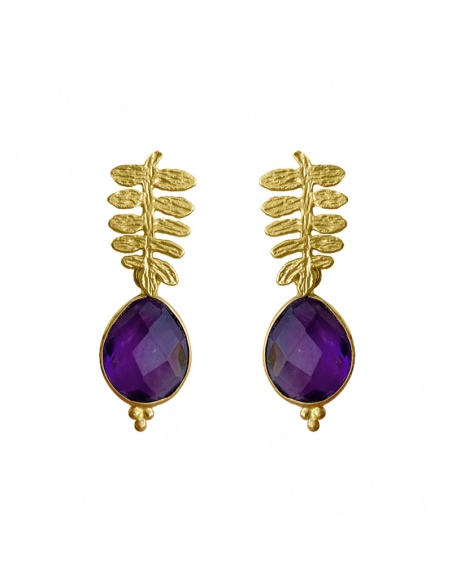 Pendientes con base de hojas doradas y colgantes de piedras amatistas en forma de lagrima bañados en oro de 18k. Pendientes con cierre de tuerca a presión.