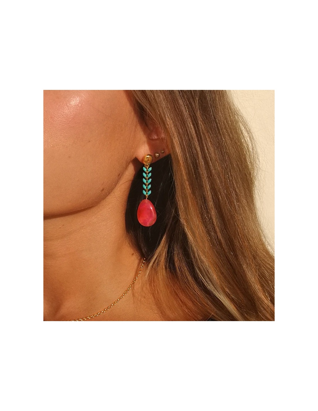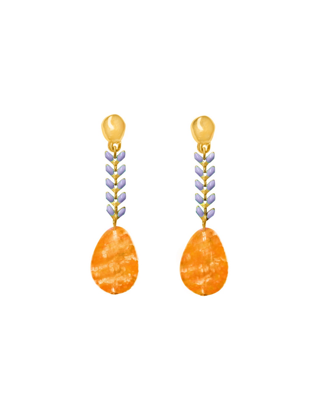Pendientes con piedras naturales d color naranja y cadena lila con bases bañadas en oro. Unos pendientes muy favorecedores perfectos para looks formales o para ceremonia y eventos especiales.