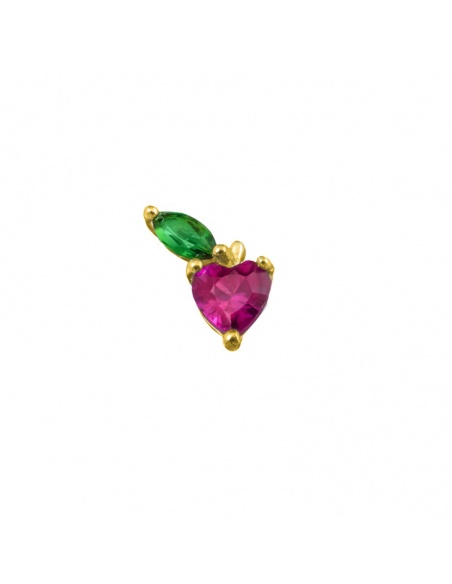 Pendiente de manzana con circonitas fucsia y verdes de plata de ley bañado en oro. Ideal para agujeros secundarios o como pendientes infantiles para niñas.