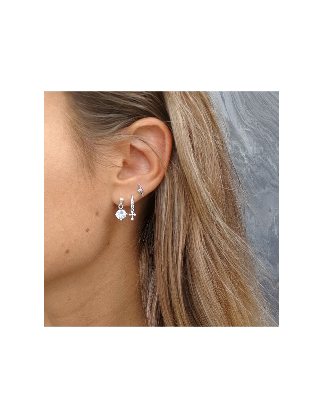 Pendiente de rayo con circonitas de colores en plata de ley 925. Pendiente ideal para combinar con otros pendientes mini en piercing secundarios. Se vende por unidad.