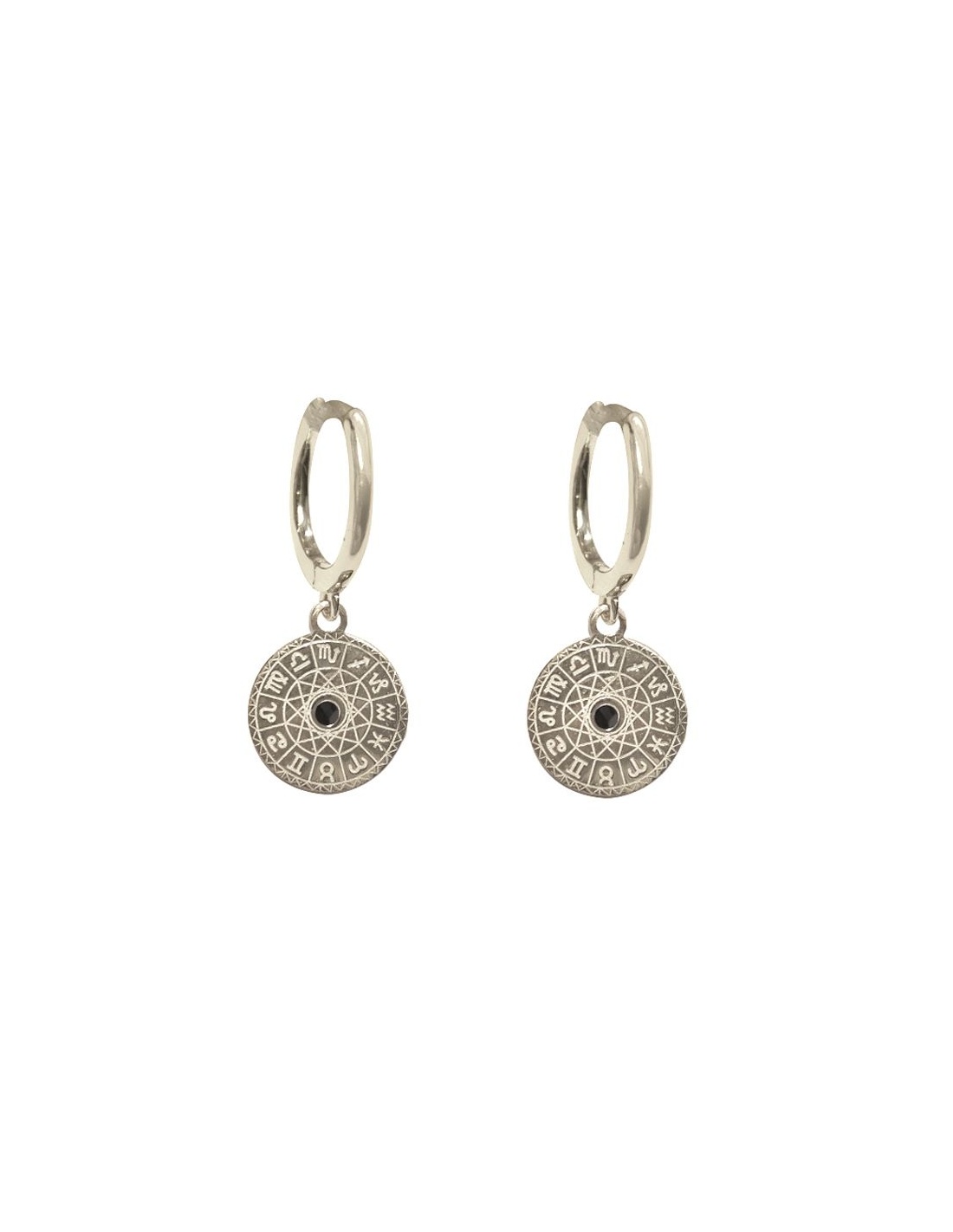 Pendiente de arito con colgante de medalla del horóscopo con circonita negra central de plata de ley 925. Unos pendientes atemporales llenos de simbolismo para los amantes del horoscopo.