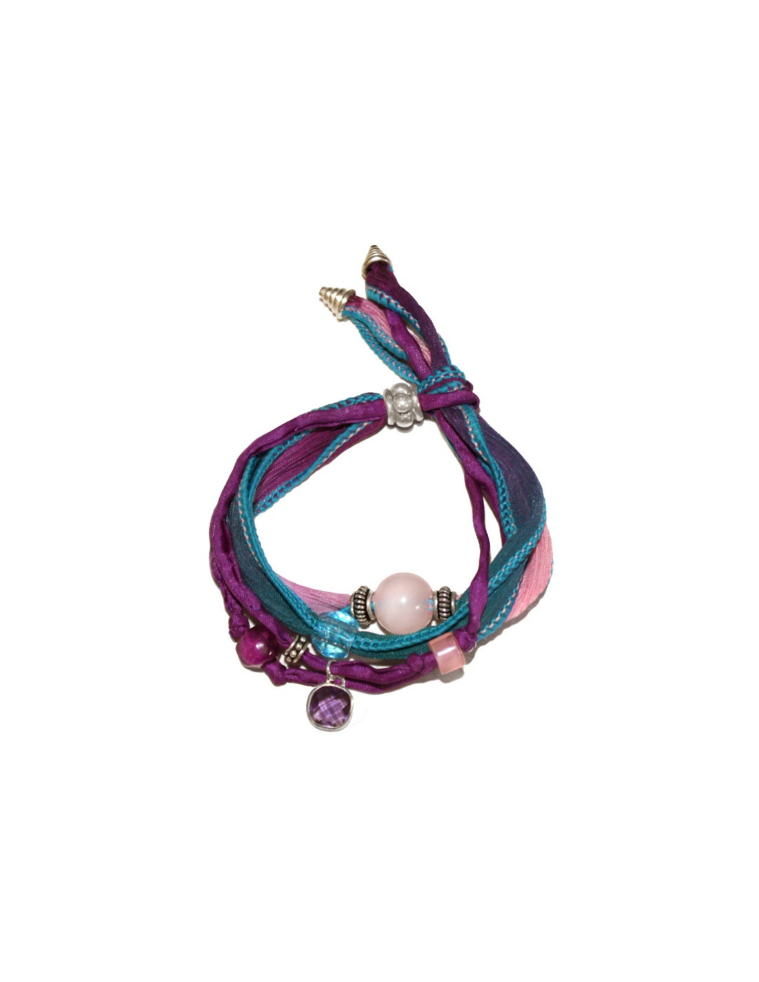 Pulsera de seda teñida a mano de color azul, morado y rosa con colgante de plata de ley y cristal morado, con abalorios de plata de ley, cuarzo rosa y resinas.