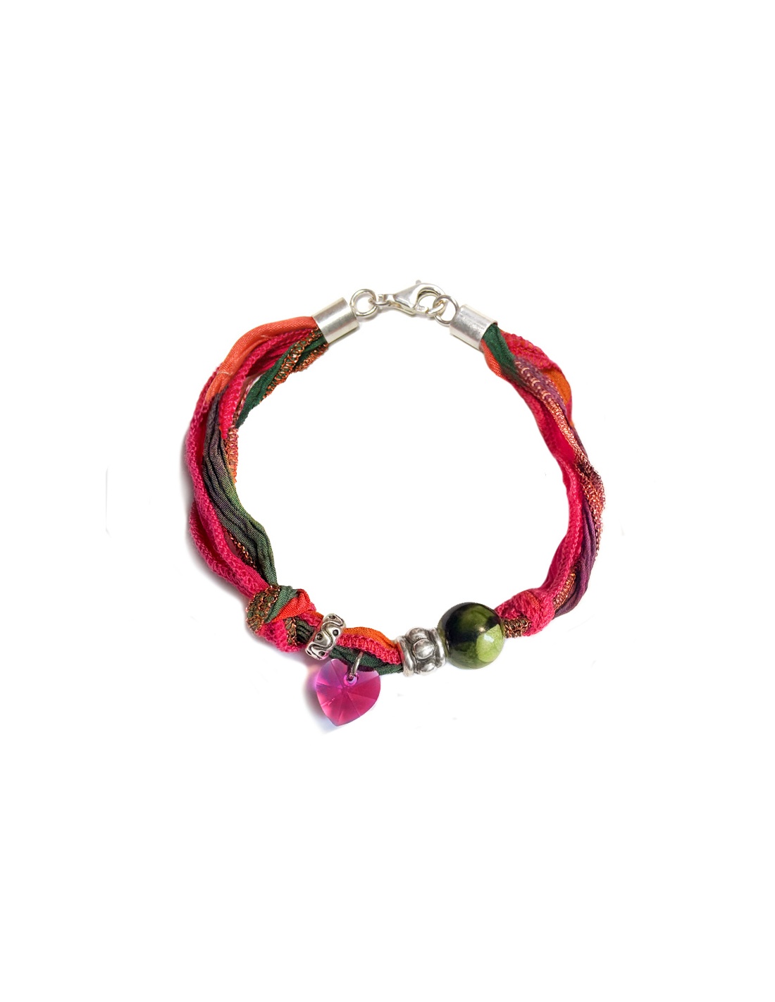 Pulsera de sedas teñidas a mano en tonalidades naranjas, fucsias, moradas yverdes y con colgante de swarovski en forma de corazón y abalorios de plata de ley.