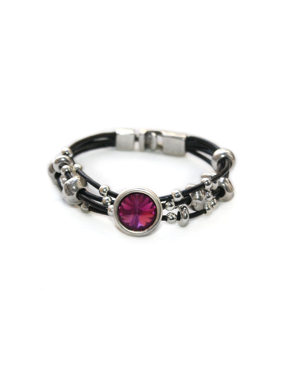 Pulsera de mujer hecha a mano con tiras de cuero negro, cristal de swarovski fucsia con diferentes cuentas bañadas en plata.