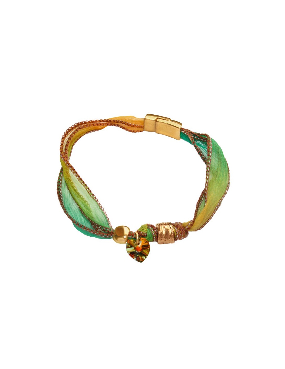 Pulsera de seda de varias tonalidades concolgante de corazón de swarovski, piezas de zamak dorado con baño de oro y cierre de imán.