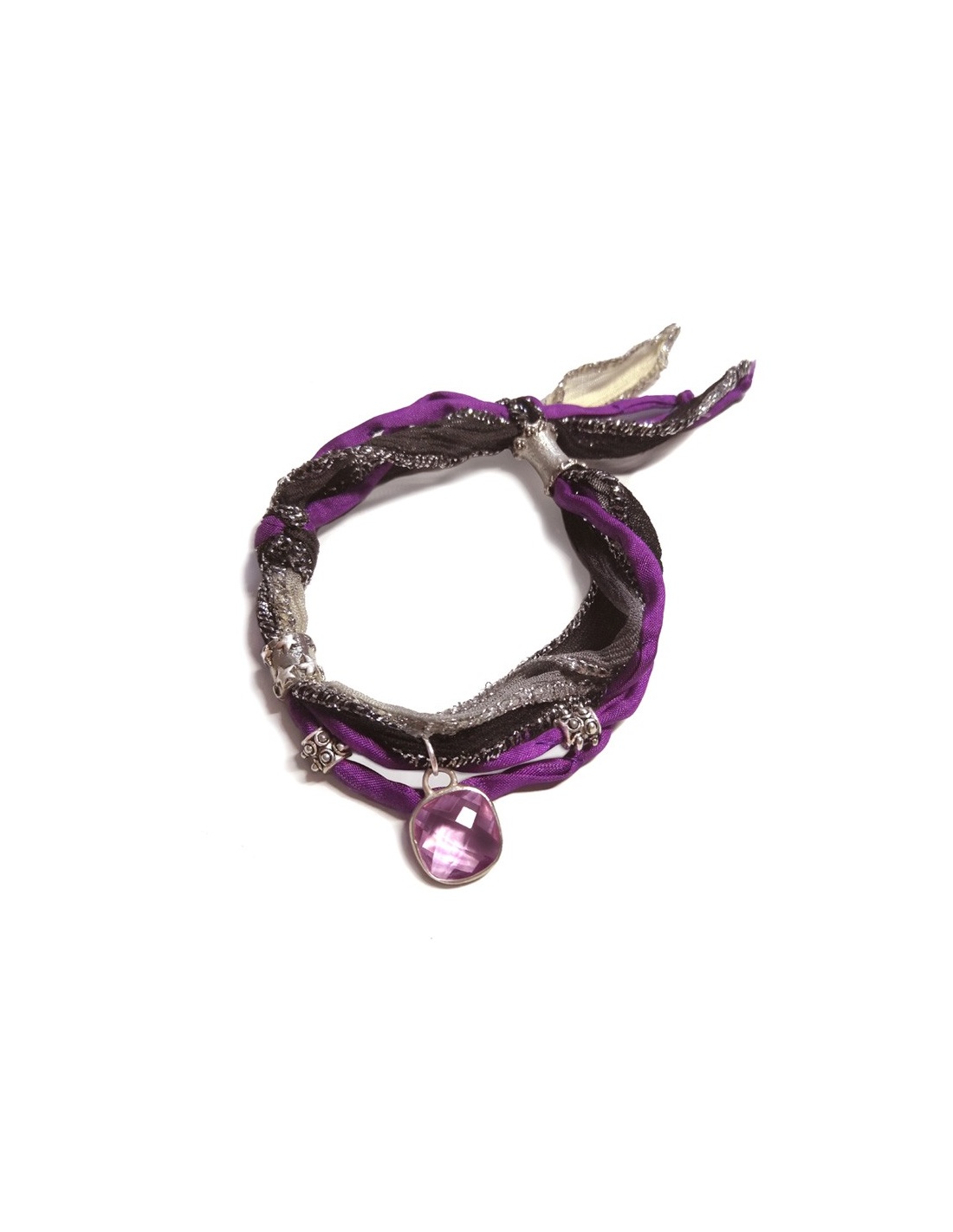 Pulsera de sedas en tonos morados, negro y plata ribeteada, colgante de cristal lila y piezas de plata de ley.
