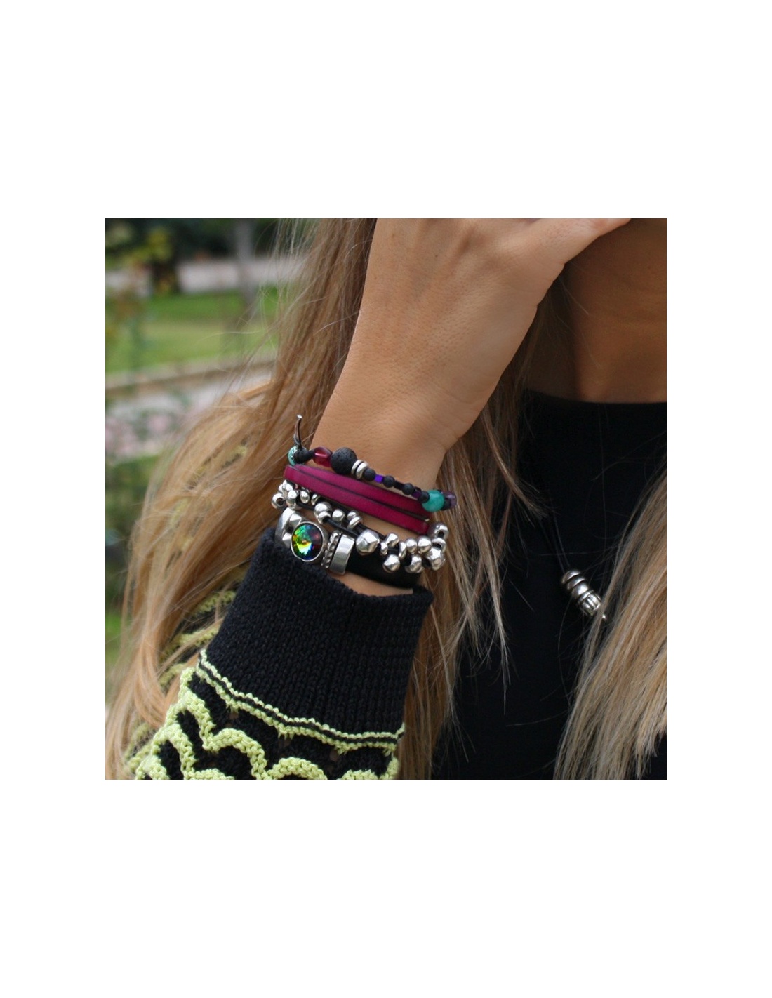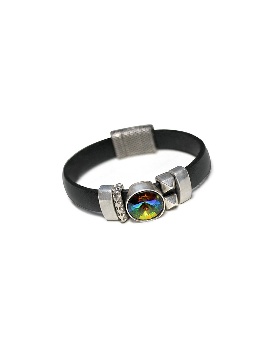 Pulsera de cuero con piezas bañadas en plata y swarovski multicolor. Pulsera con cierre de imán.