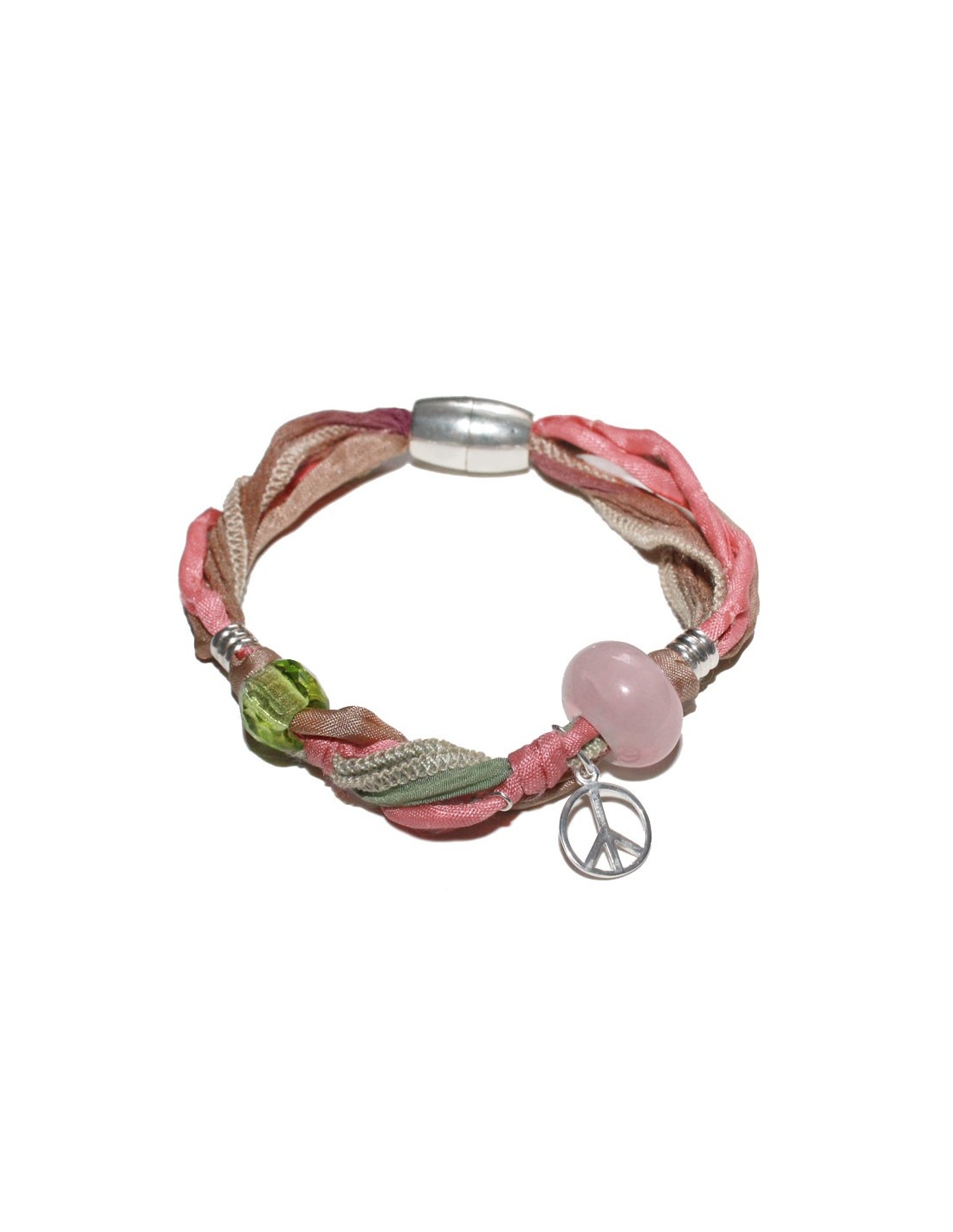 Pulsera artesanal de plata de ley con sedas naturales, cuarzo rosa, charm del símbolo de la paz y cierre de imán