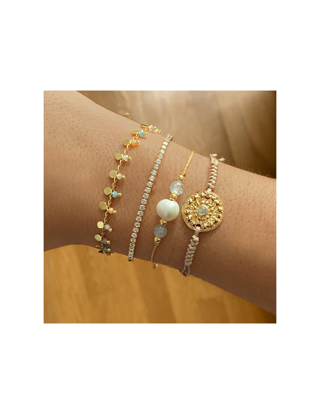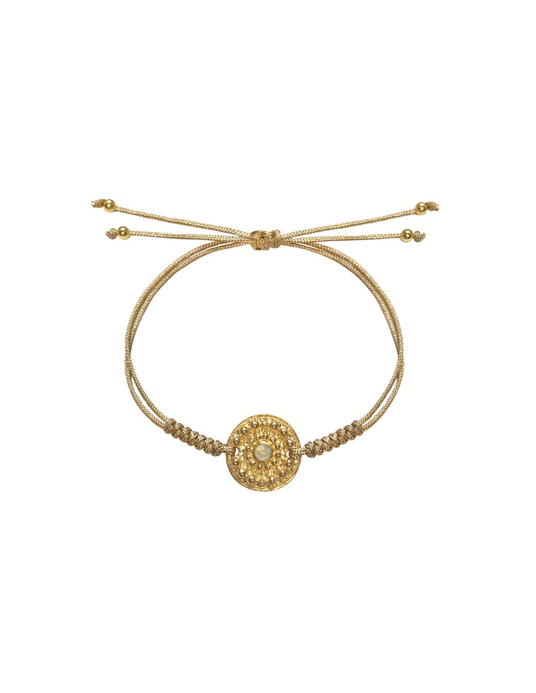 Pulseras con pieza central tipo medalla con piedra de luna circular de plata 925 bañada en oro, acompañada de cordón de seda beige. Una pulsera original hecha a mano que seguro se convierte en una de tus favoritas.
