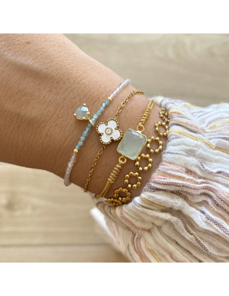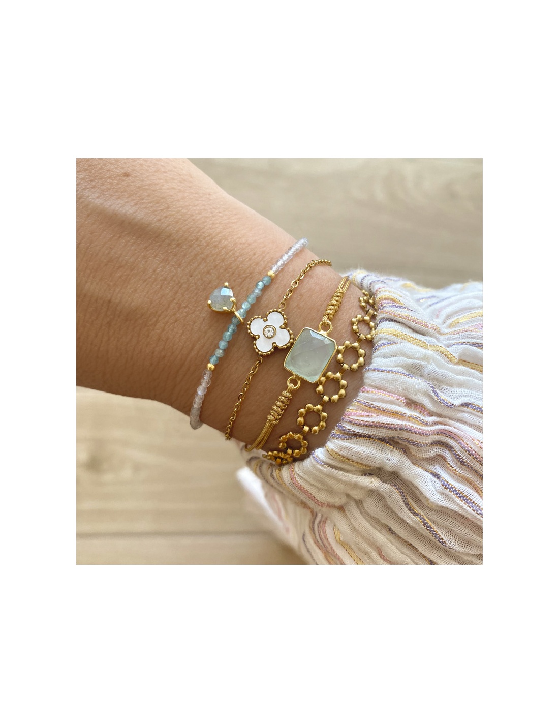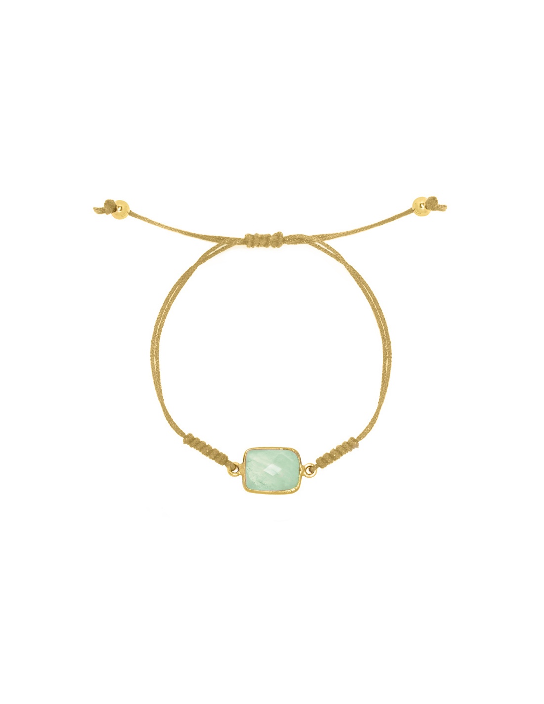 Pulsera con pieza de crisoprasa rectangular de plata bañada en oro y cordón dorado.